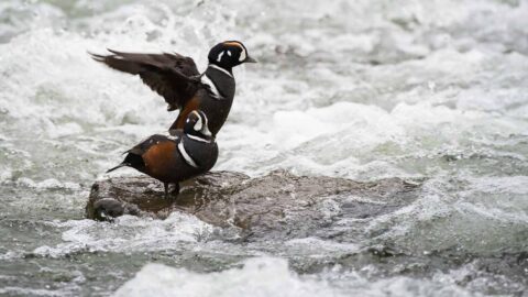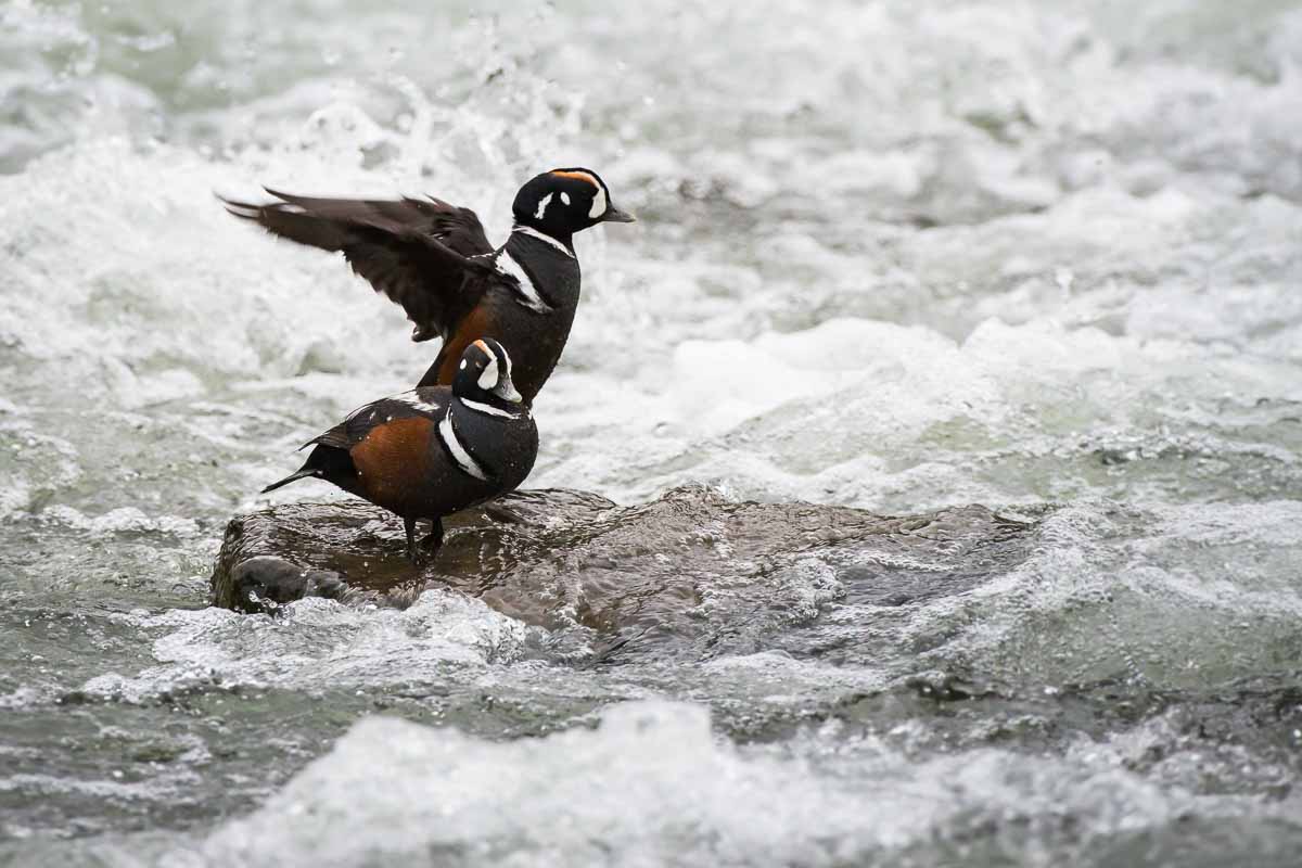 In fact, choppy waters – salt or fresh water – is the advantage harlequins have over their predators, be it mink or raptors. Under threat? They take cover in a place where no predator – no human – would dare venture.