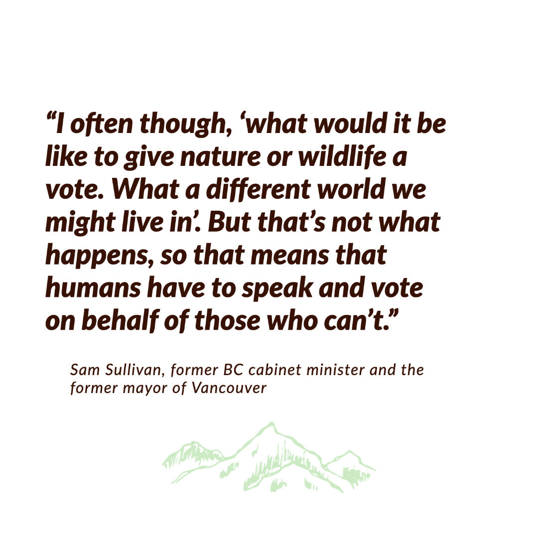 Which is why, to save our species at risk, Sam Sullivan believes “people have to feel that there is something in it for them; that they are benefiting – or not benefiting – just as much as everybody else.”