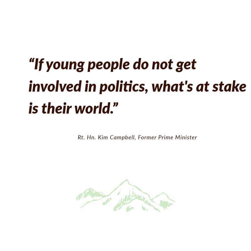 What does that mean for us? Well, Kim Campbell reminds us, “We can’t all be in parliament. We have to decide what it is that that we can contribute and want to contribute. You know, if you’re somebody who has your heart set on being a doctor, you will take a different approach than somebody who wants to get a bachelor’s degree in science and then go on into direct engagement. The thing is, find what your passion is, find out what you’re good at, what you feel you can do to contribute, and then do it.”