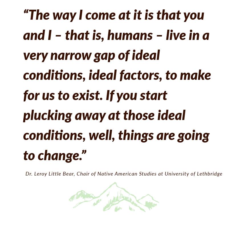 “Being a little bit less Blackfoot with its absence (the buffalo), it would be similar this: In our modern world, we have sacred Christian places. What if all of a sudden, the Vatican was no more, say? Well, you could still have all the church beliefs; you could still have all the Christian beliefs; you could still practice them. But without that kind of iconic symbol out there, see, there’s something missing. If the churches were taken away, or all closed down, hey, you could still have all the beliefs, and the people still have all the beliefs, but they were just a little bit less Christian.”