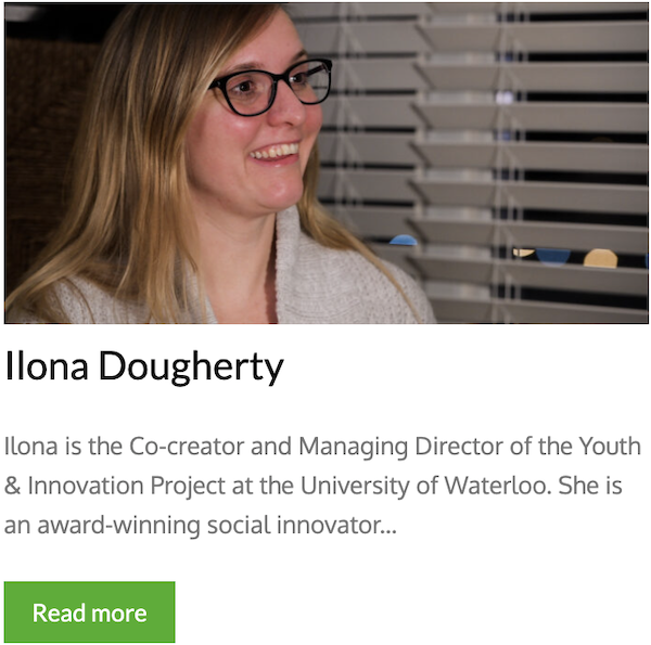 Ilona’s life-long work has focused on advocating for youth participation in the issues and decisions being made that affect their future. She co-founded Apathy is Boring as a rising leader and today is the co-creator of the Youth & Innovation Project at the University of Waterloo.