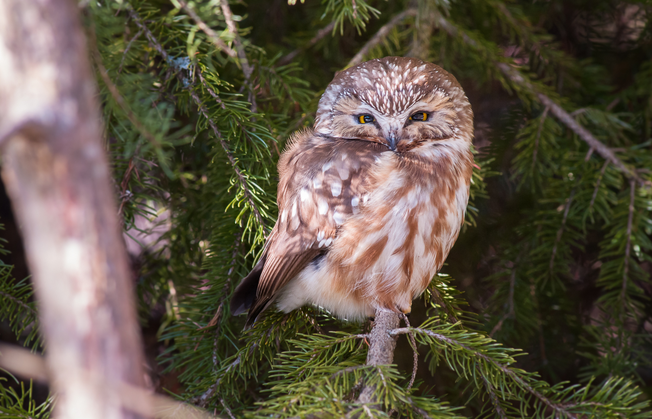 Which brings us to the saw-whet. Unlike the pygmy, 98% of its diet is rodents. Like the boreal owl, it also likes the night and the forest. But unlike the boreal, it wants some openness – like what you find in a deciduous forest rather than a dense coniferous forest. And, also unlike the hawk or boreal owls, who prefer the cold northlands, the saw-whet – like most people – also likes a bit of evening warmth and less precipitation.